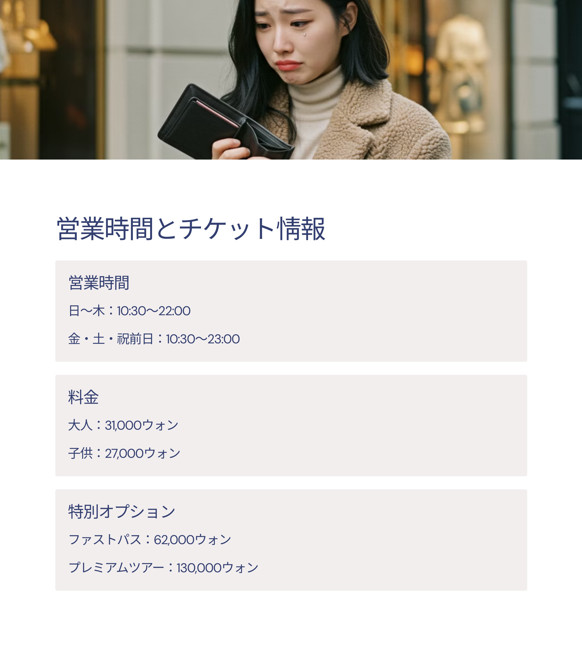 - 一般プレミアムツアー:130,000ウォン(入場券、ツアー利用券、写真2枚含む)