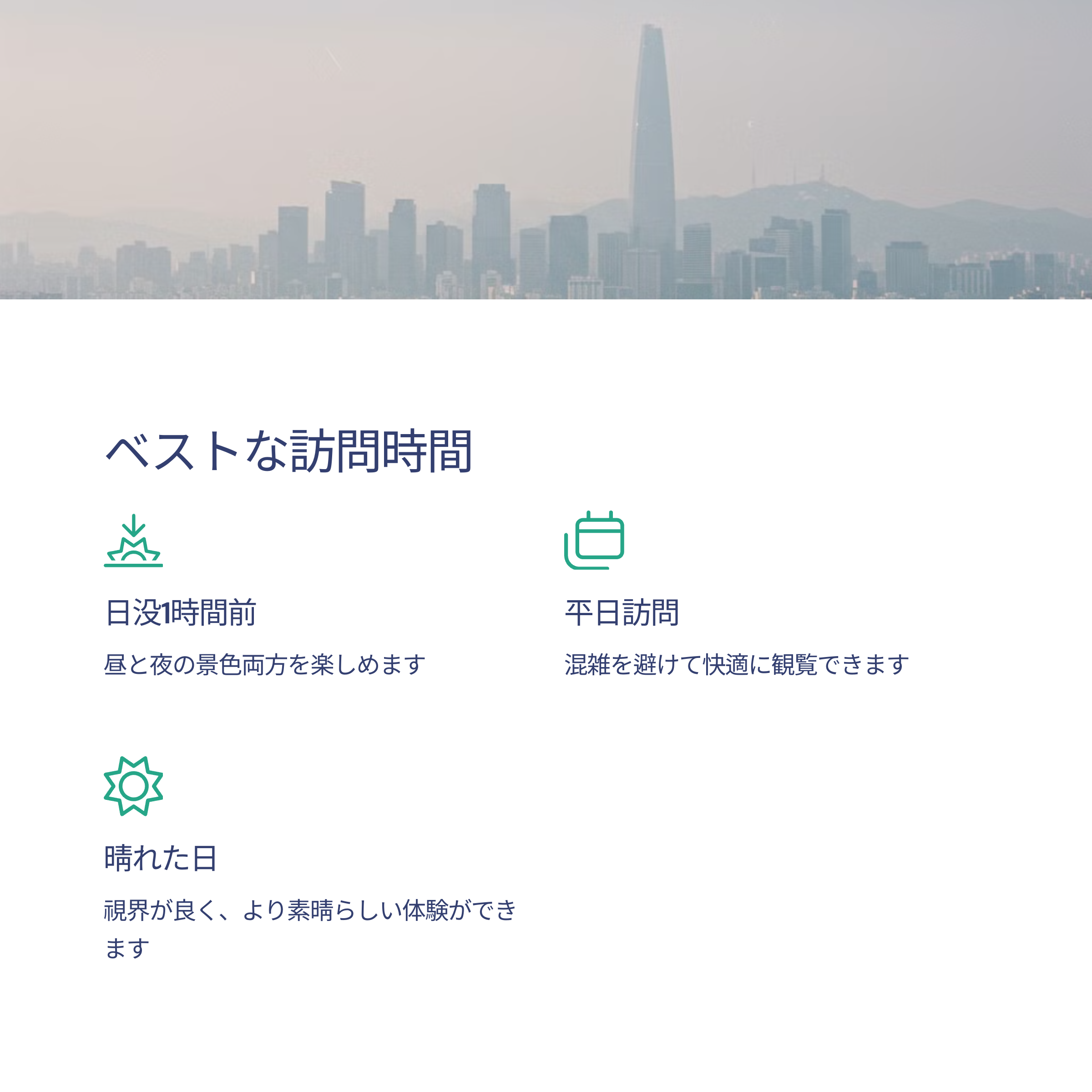 - 🌆 晴れた日を選んで訪れると、視界が良く、より素晴らしい体験ができます