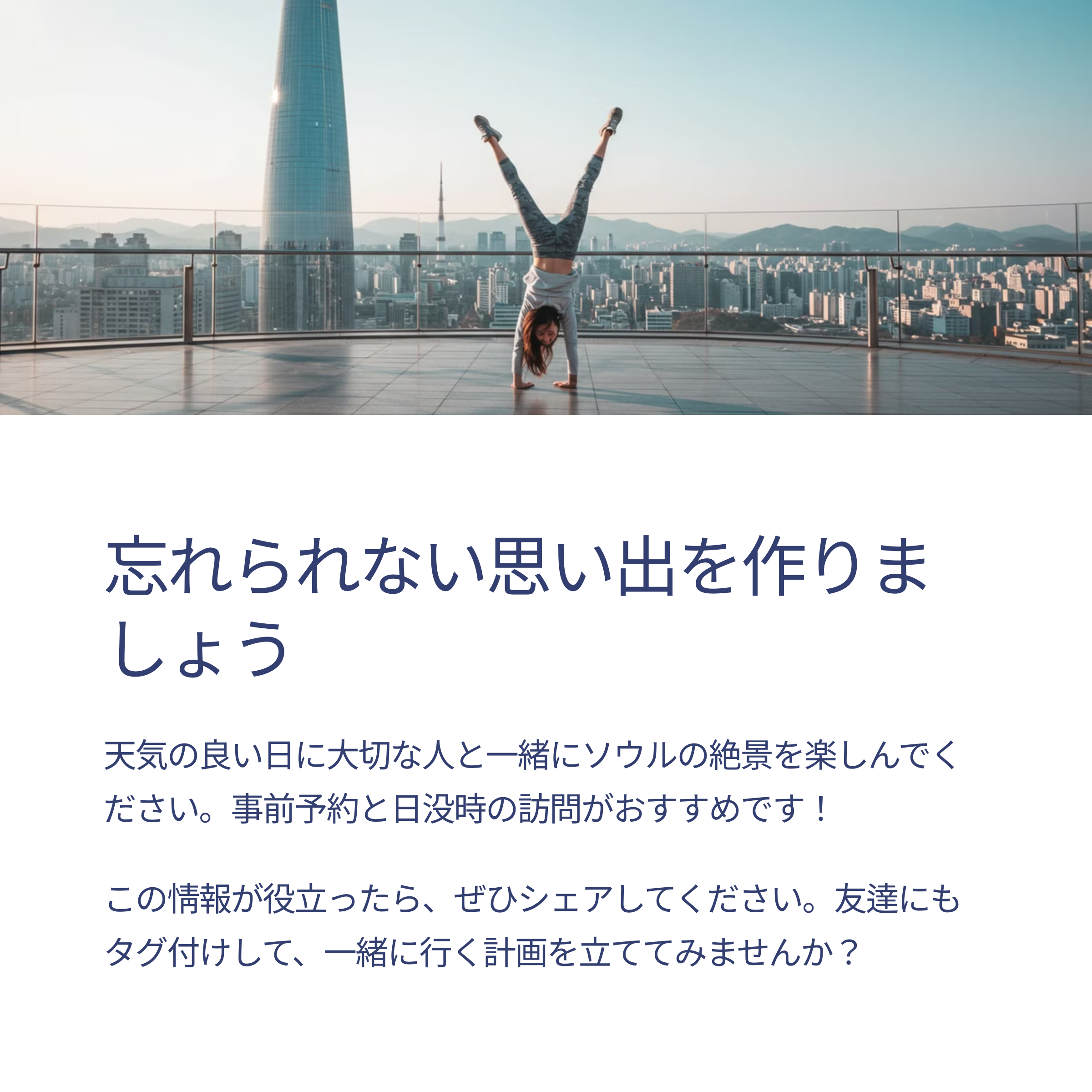 ロッテタワー展望台は、ソウルの美しい景色を一望できる特別な場所です。この記事で紹介した情報を参考に、割引特典をうまく活用し、最適な時間に訪れて後悔のない体験をしてください。
