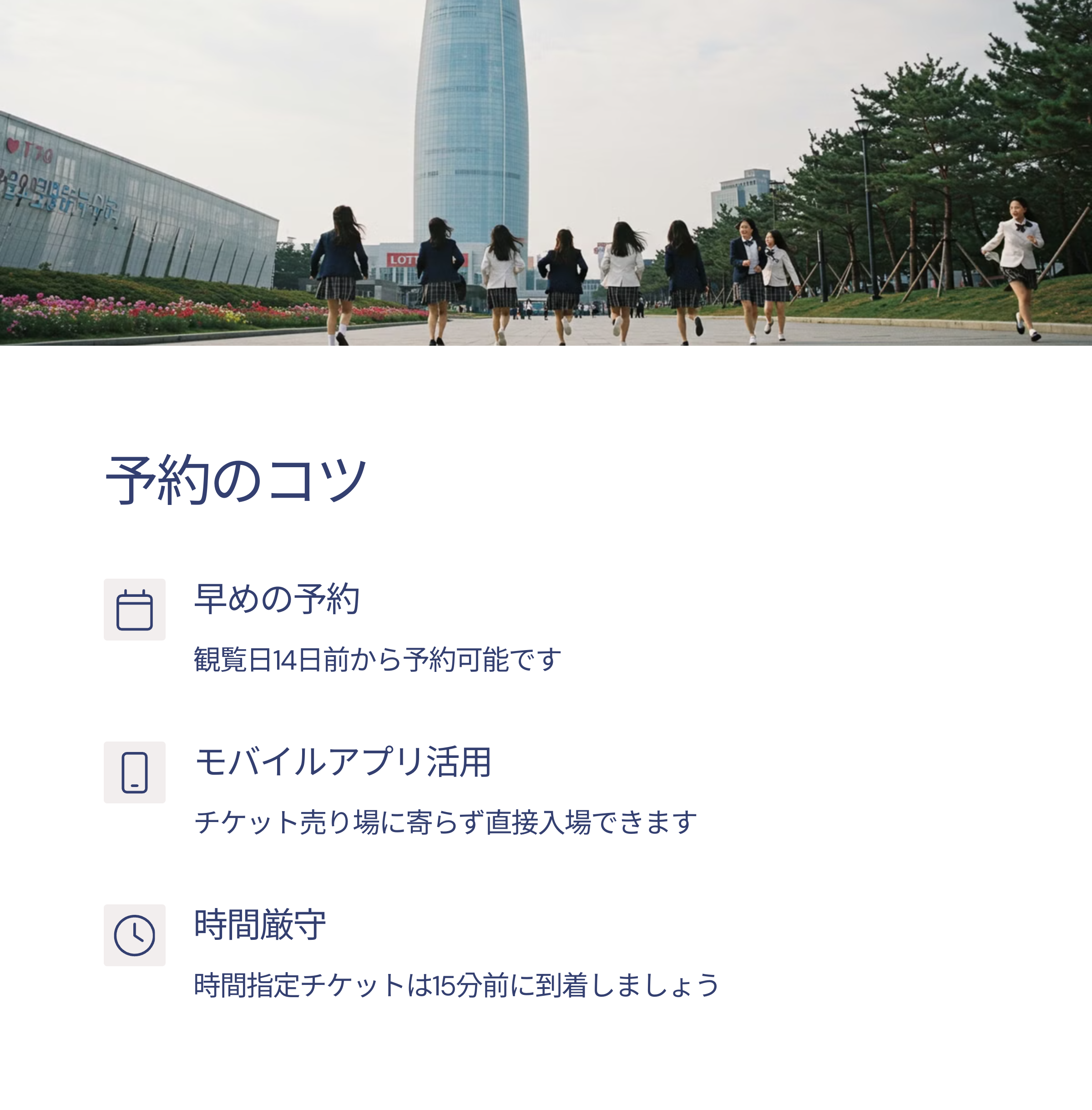 - 📱 モバイルアプリで予約すると、チケット売り場に寄らずに直接入場できます