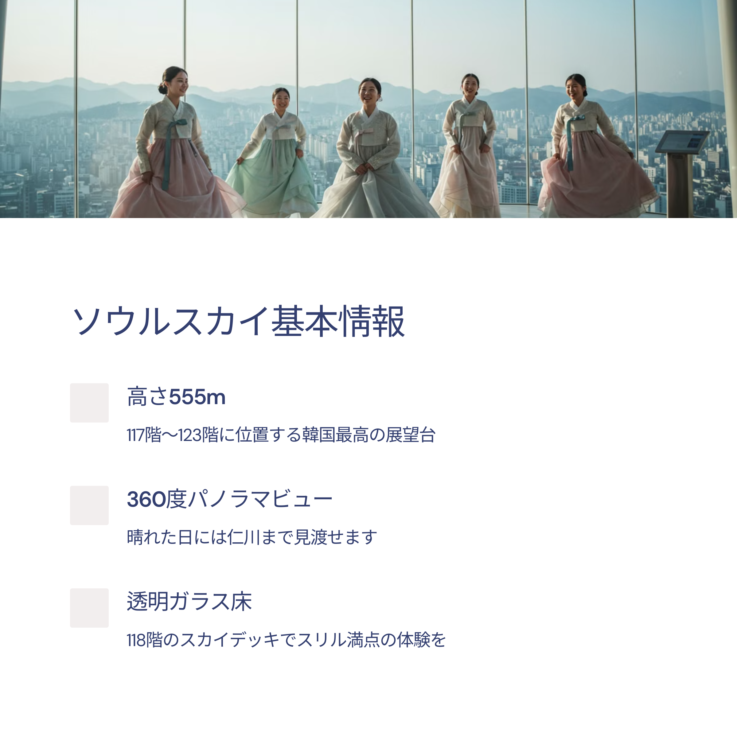 こんにちは!ソウルの象徴的な建物、ロッテワールドタワーの展望台(ソウルスカイ)へようこそ。ここでは、ソウルの息をのむような景色を一望できます。この記事では、あなたの訪問をより楽しく、効率的にするための全ての情報をお伝えします。