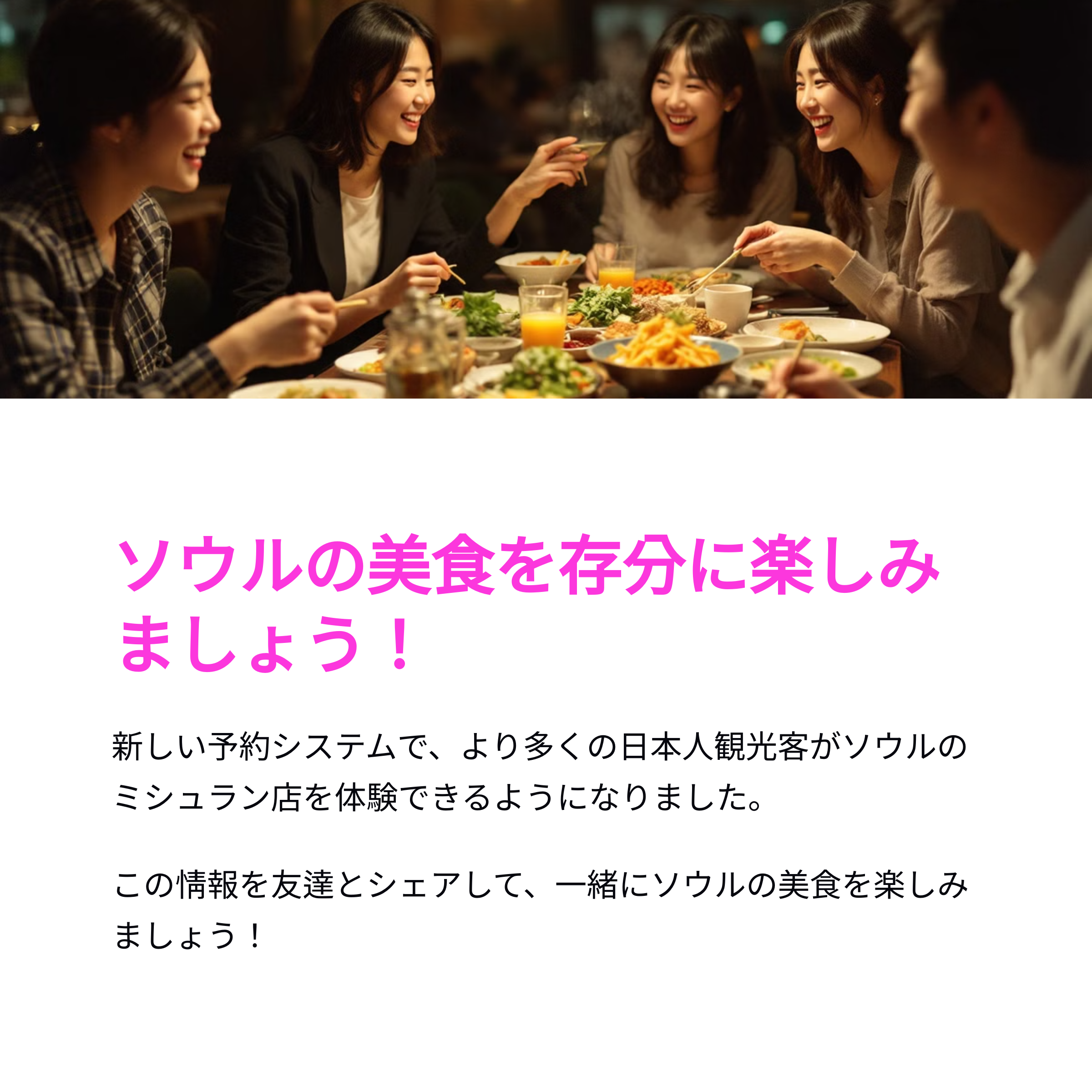 ソウルの食文化は日本人観光客の旅行満足度に大きな影響を与える要素です。今では簡単な予約システムを通じて、より多くの日本人観光客がソウルの様々なミシュラン店を体験できるようになりました。ソウルを訪れる予定がある方は、ぜひこの情報を活用してみてください!😊