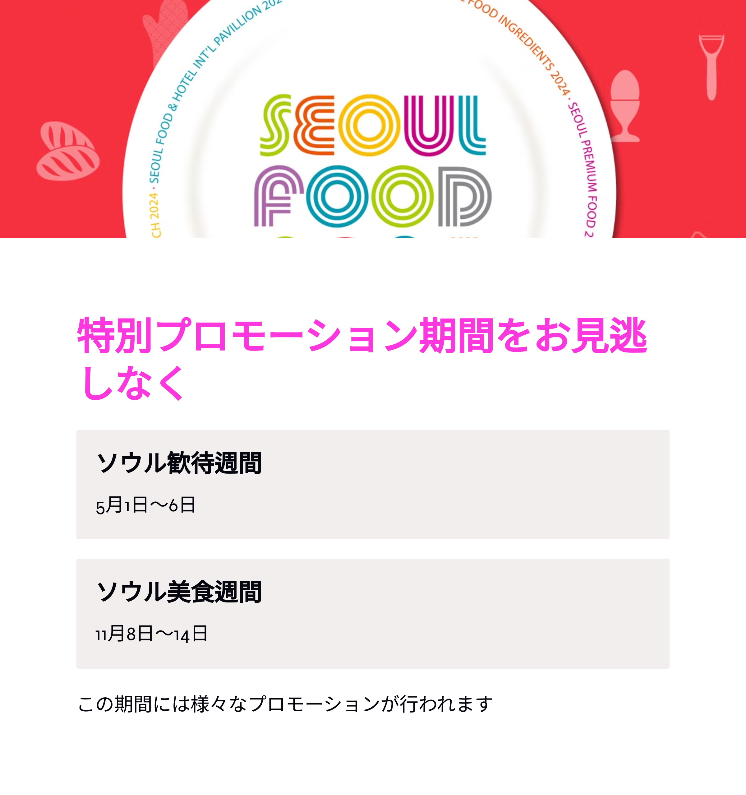 この期間には様々なオンライン・オフラインプロモーションが行われ、日本人観光客がソウルの食文化をより簡単に体験できます。