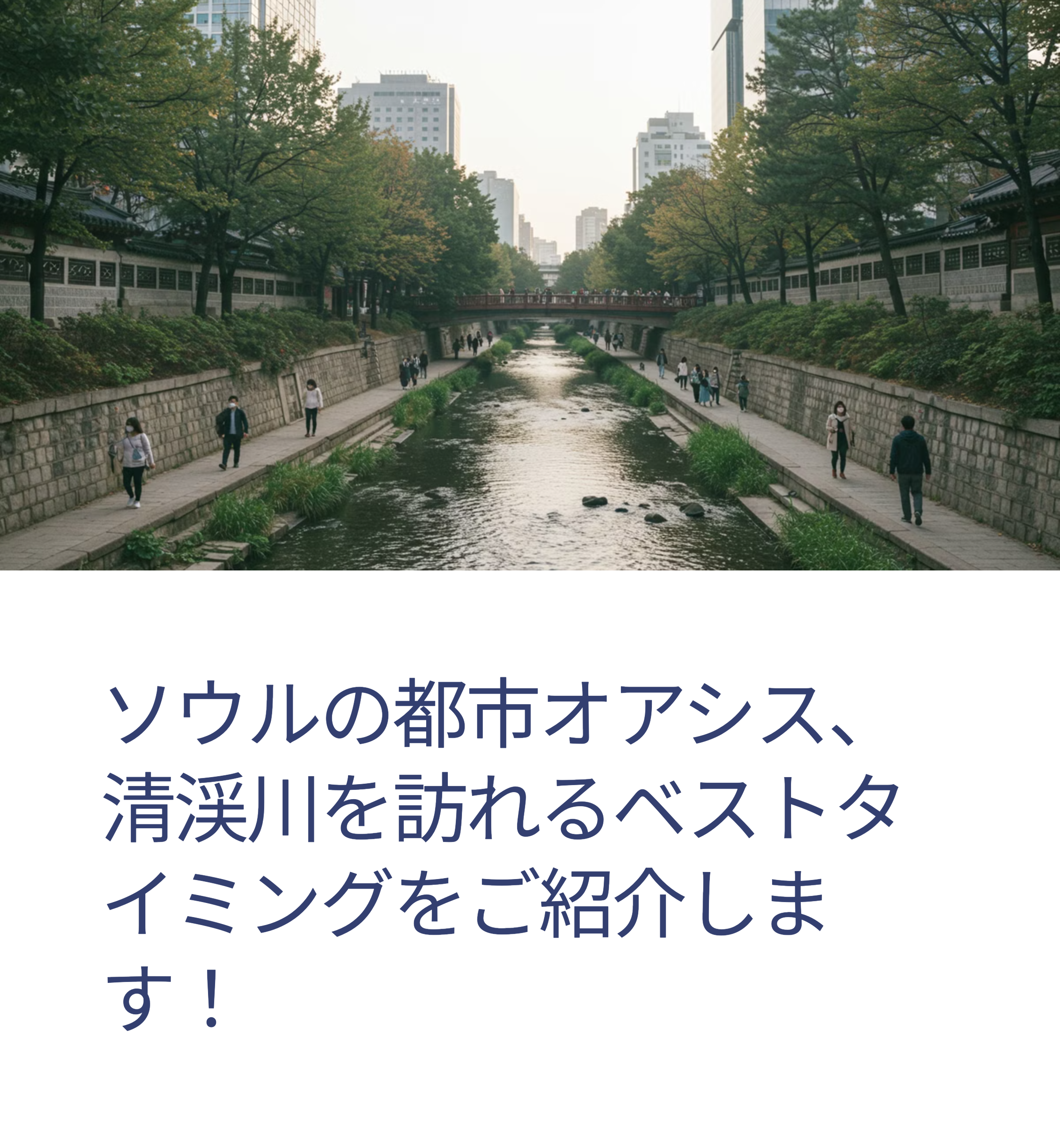 ソウルの清渓川を訪れるベストタイミングを、季節ごとの見どころや最適な時間帯とともに紹介。この都市のオアシスで思い出に残る体験をするための実用的なヒントもお届けします。清渓川、散策ベストタイム、ソウル市内散歩、清渓川春、清渓川秋、ソウルランタンフェスティバル、清渓川デート、清渓川コース、清渓川アクセス