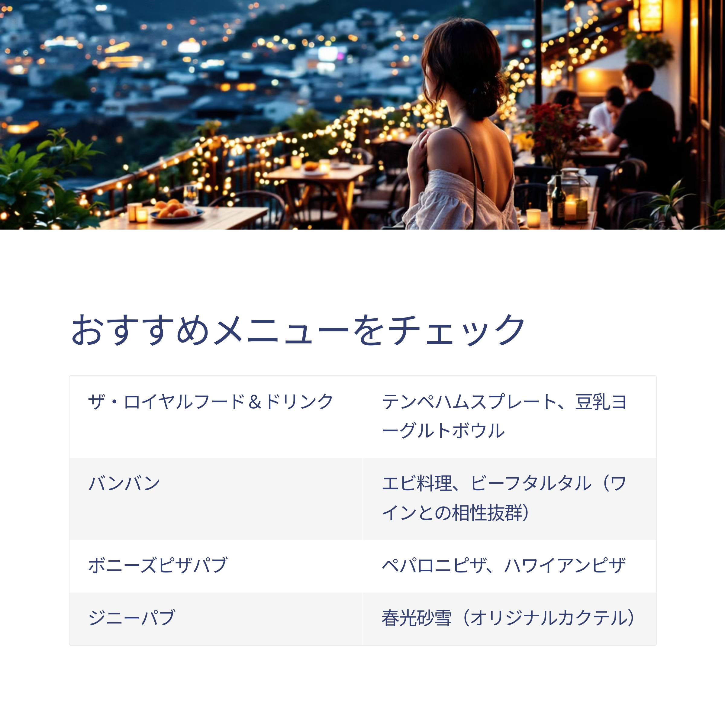 - おすすめデートコース: バンバン → アーバンクリフ → ザ・ロイヤルフード&ドリンクという順番で巡れば完璧なデートプランになります!