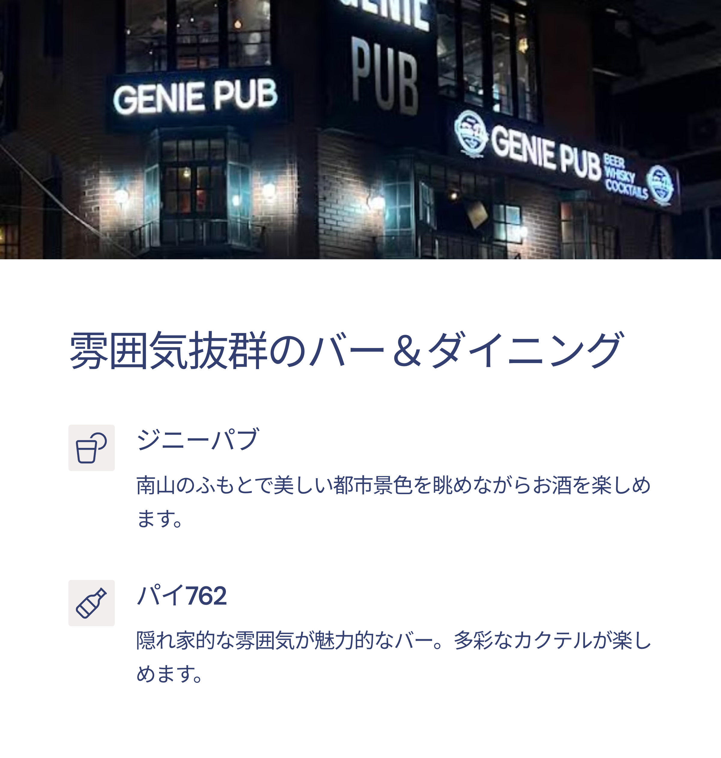 南山(ナムサン)のふもとに位置し、美しい都市の景色を眺めながらお酒を楽しめるスポットです。