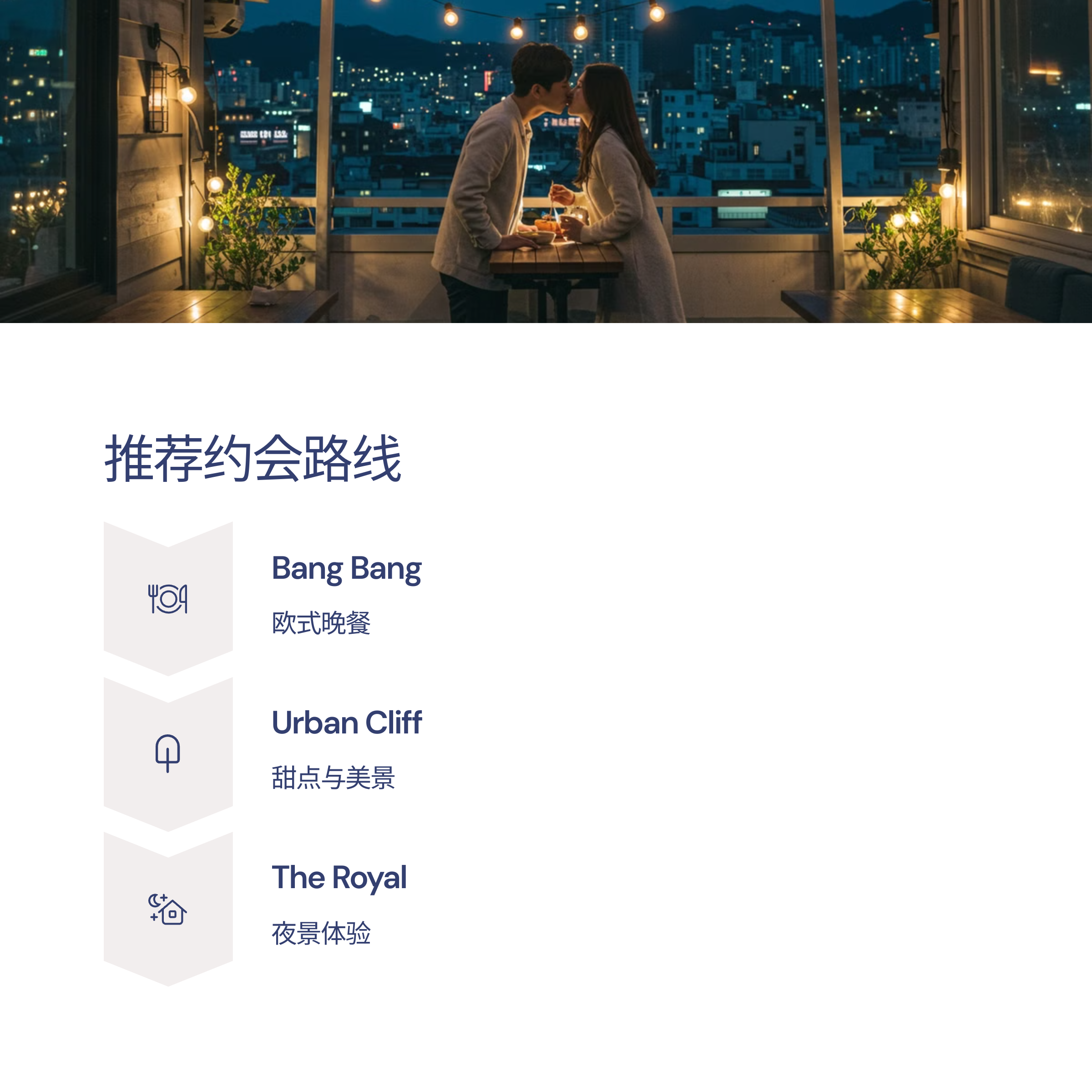 - 推荐约会路线: Bang Bang → Urban Cliff → The Royal Food & Drink,这样可以享受从晚餐到甜点再到夜景的一站式体验!
