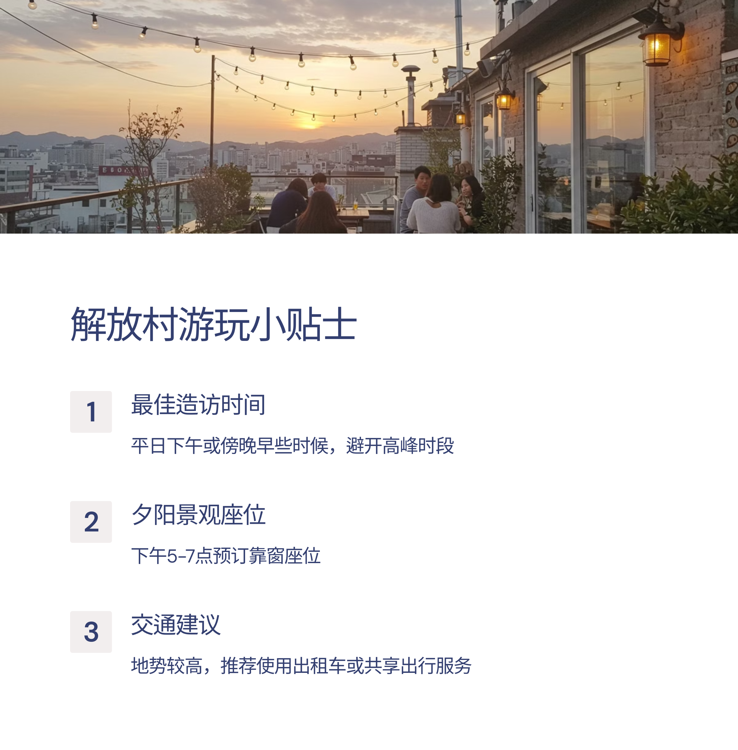 - 交通建议: 解放村地势较高,步行或乘坐公共交通可能不太方便,推荐使用出租车或共享出行服务。