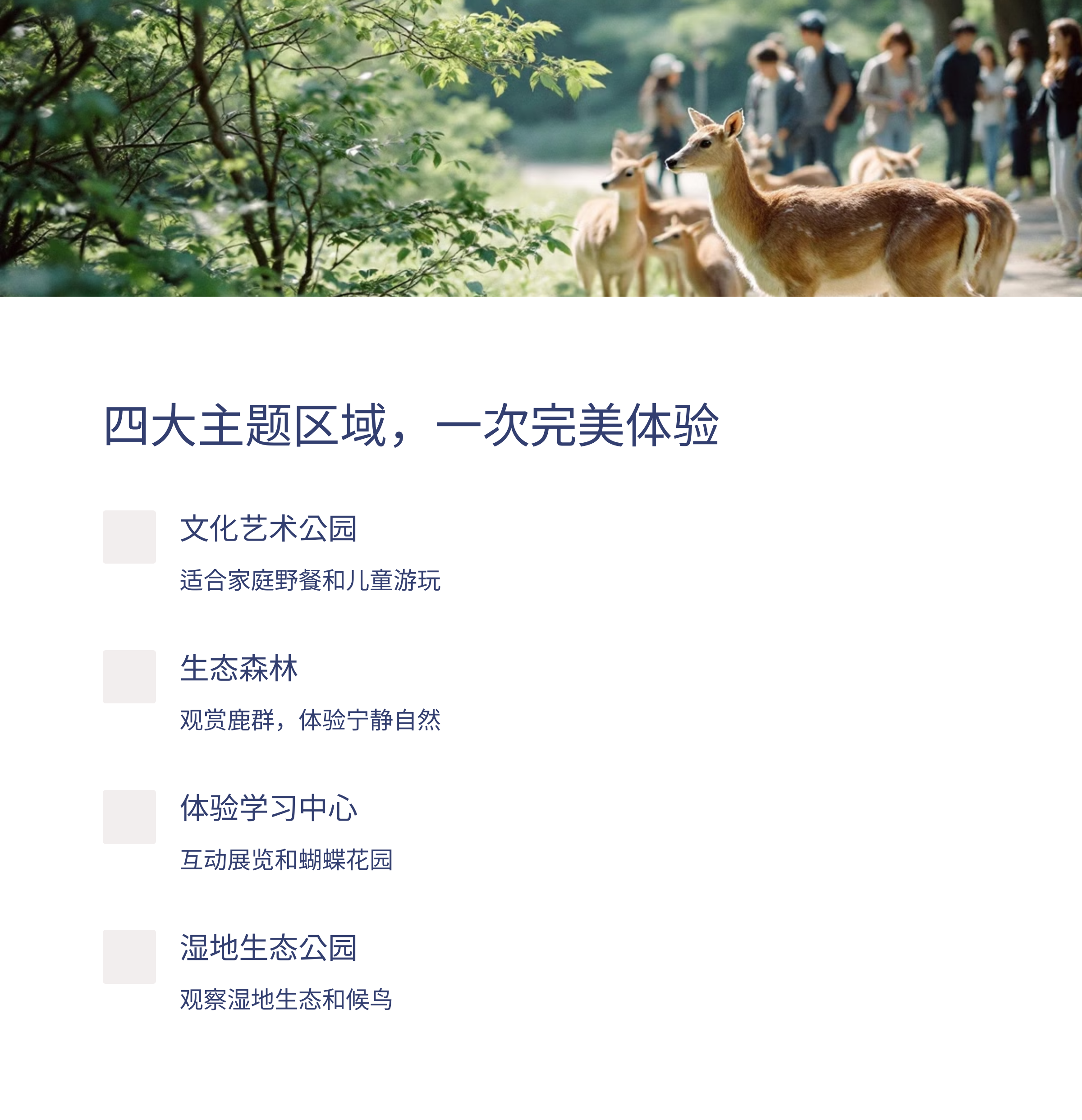 文化艺术公园 → 午餐 → 生态森林(观鹿) → 湿地生态公园