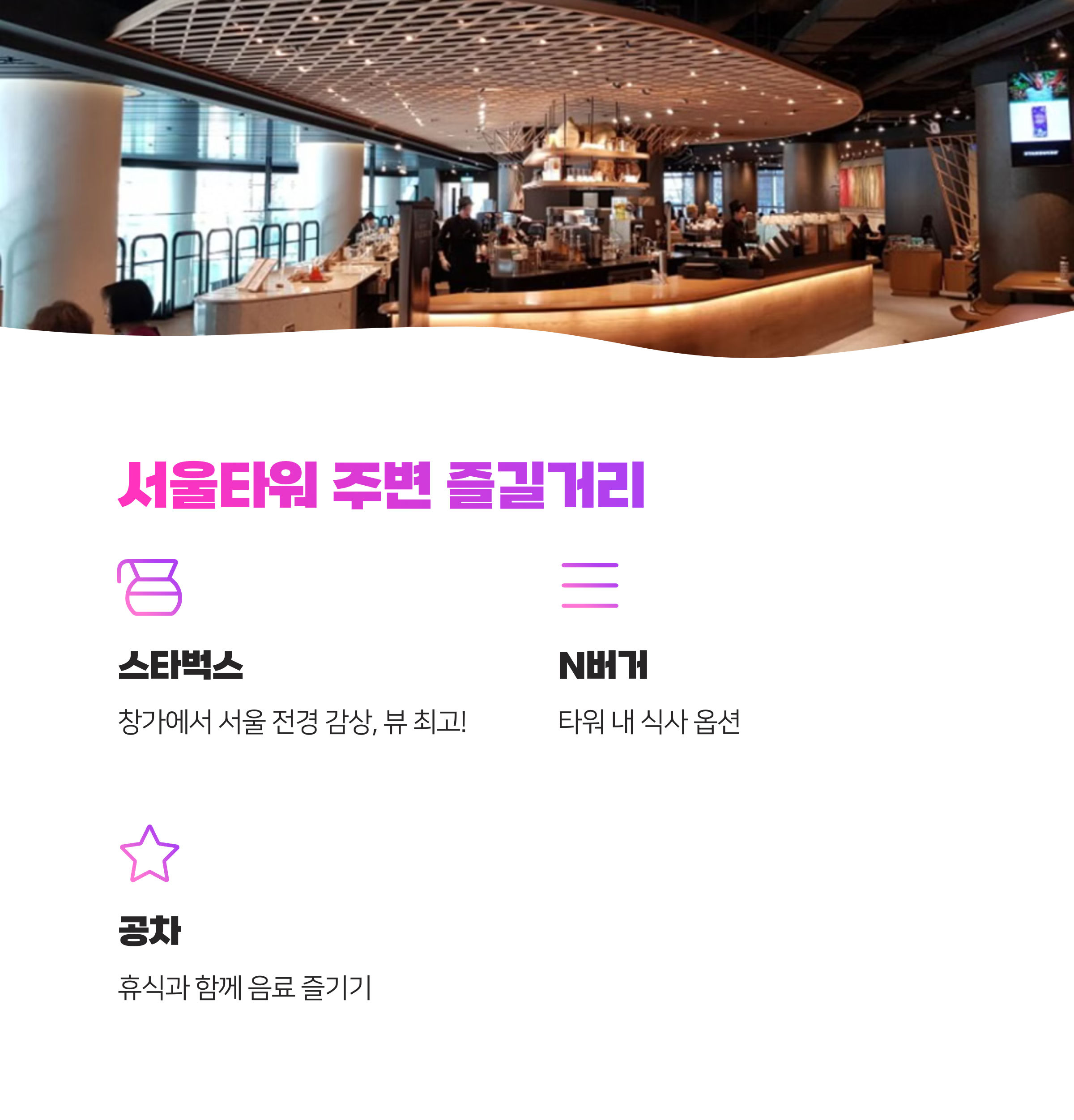 서울타워 내부와 주변에는 다양한 식음료 시설이 있어요. 스타벅스, N버거, 공차 등 유명 브랜드의 매장들이 입점해 있어 편하게 휴식을 취할 수 있답니다.