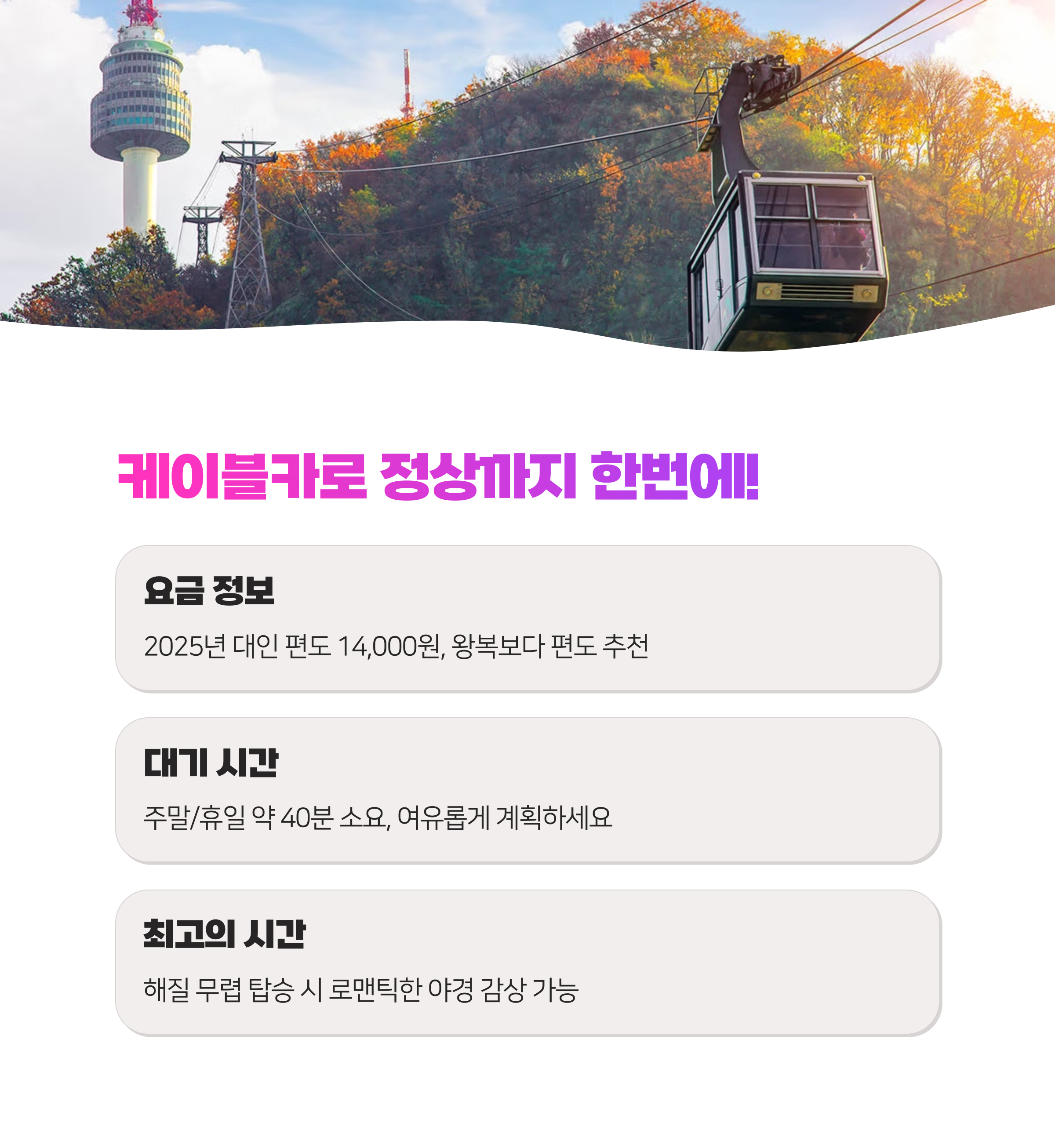 주말이나 휴일에는 케이블카 대기 시간이 약 40분 정도 소요되니 시간 계획을 여유롭게 세우는 것이 좋아요.