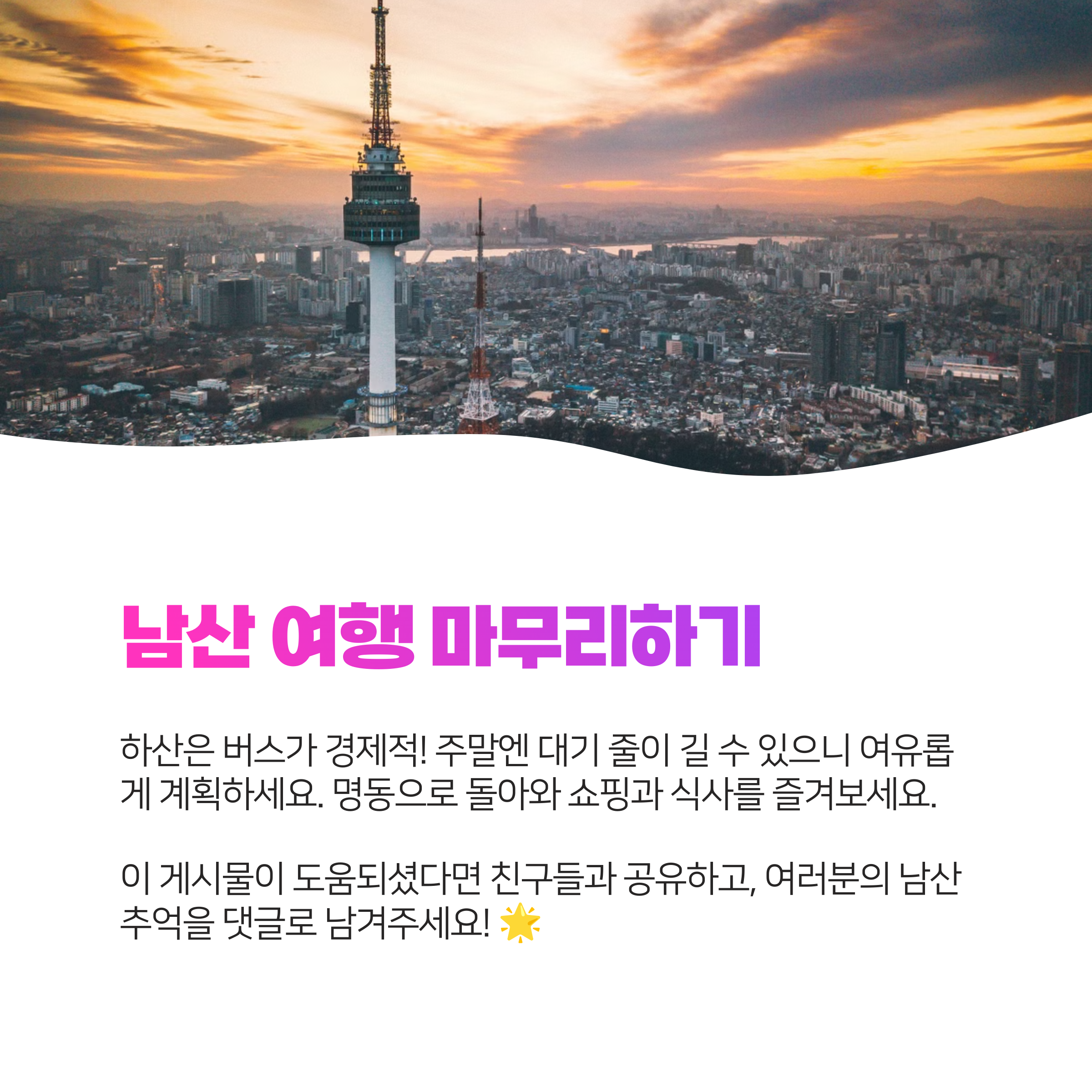 이 가이드를 따라 남산을 방문하면 서울의 아름다움을 효율적으로 경험할 수 있어요. 여러분만의 특별한 남산 추억을 만들고, 소중한 사람들과 이 멋진 경험을 나눠보세요! 🌟