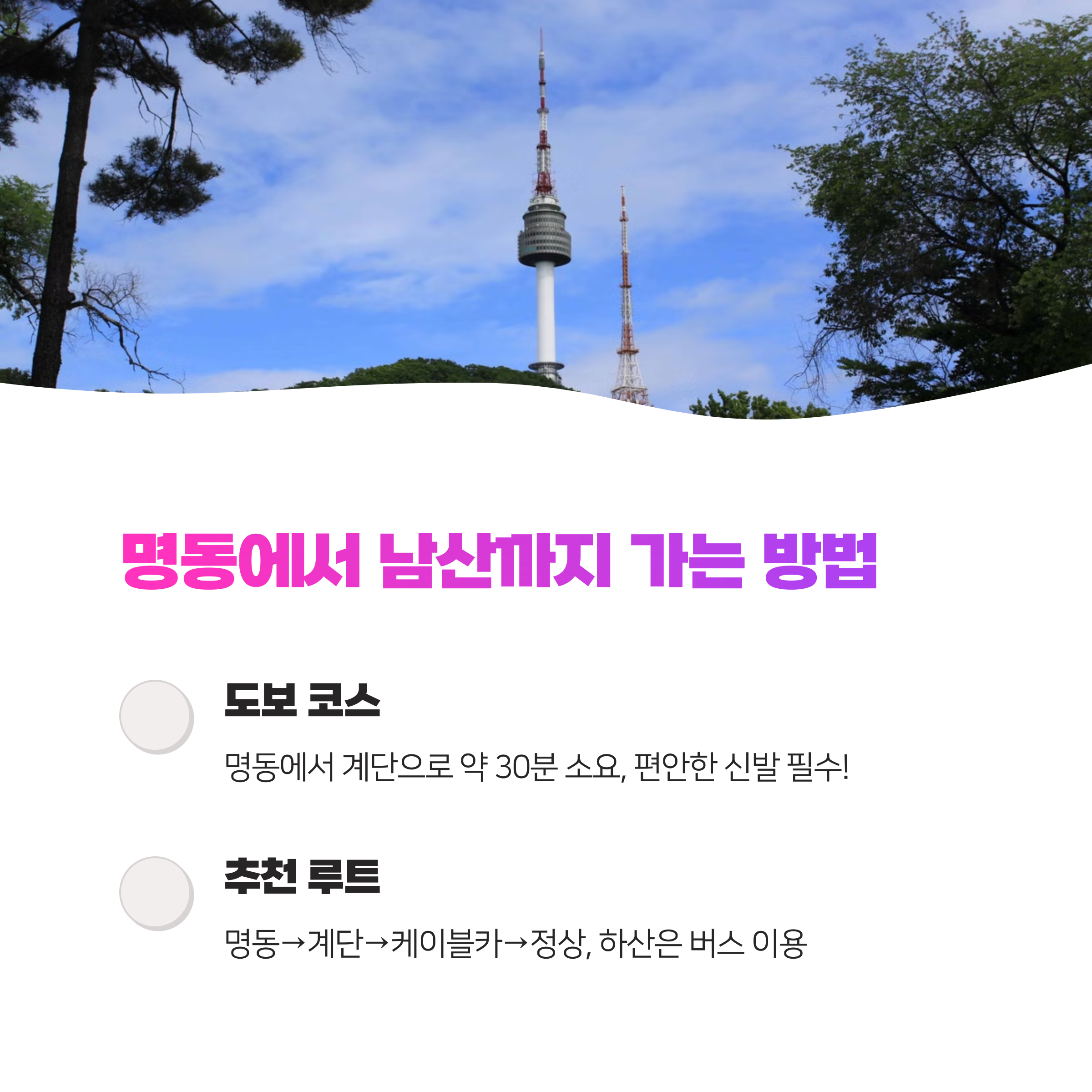 추천 코스는 명동에서 출발해 계단을 통해 올라간 후, 케이블카를 이용해 정상으로 올라가고, 돌아올 때는 버스를 타고 내려오는 방법이에요.