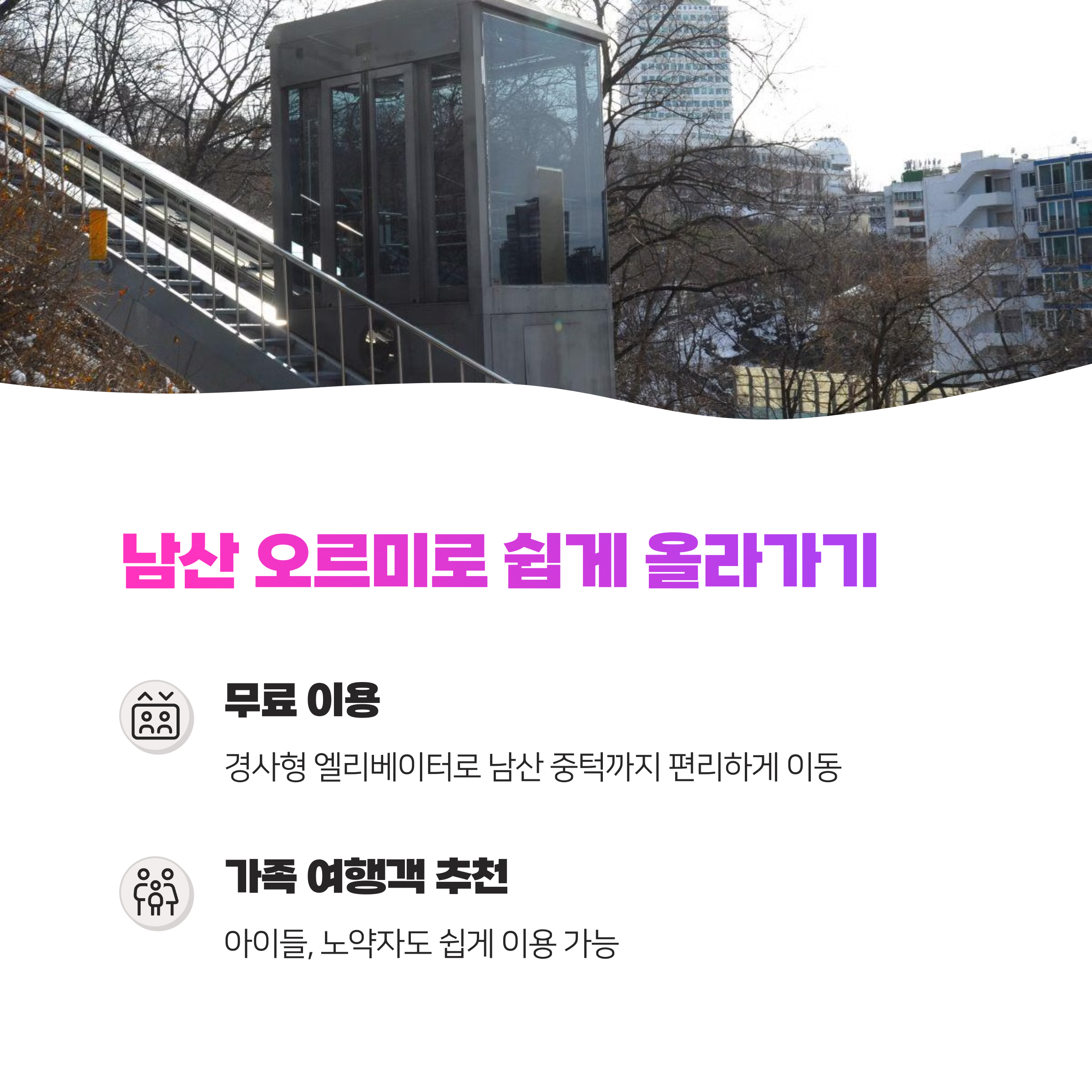 남산 오르미는 경사형 엘리베이터로, 힘들게 계단을 오를 필요 없이 남산 중턱까지 편리하게 이동할 수 있어요.