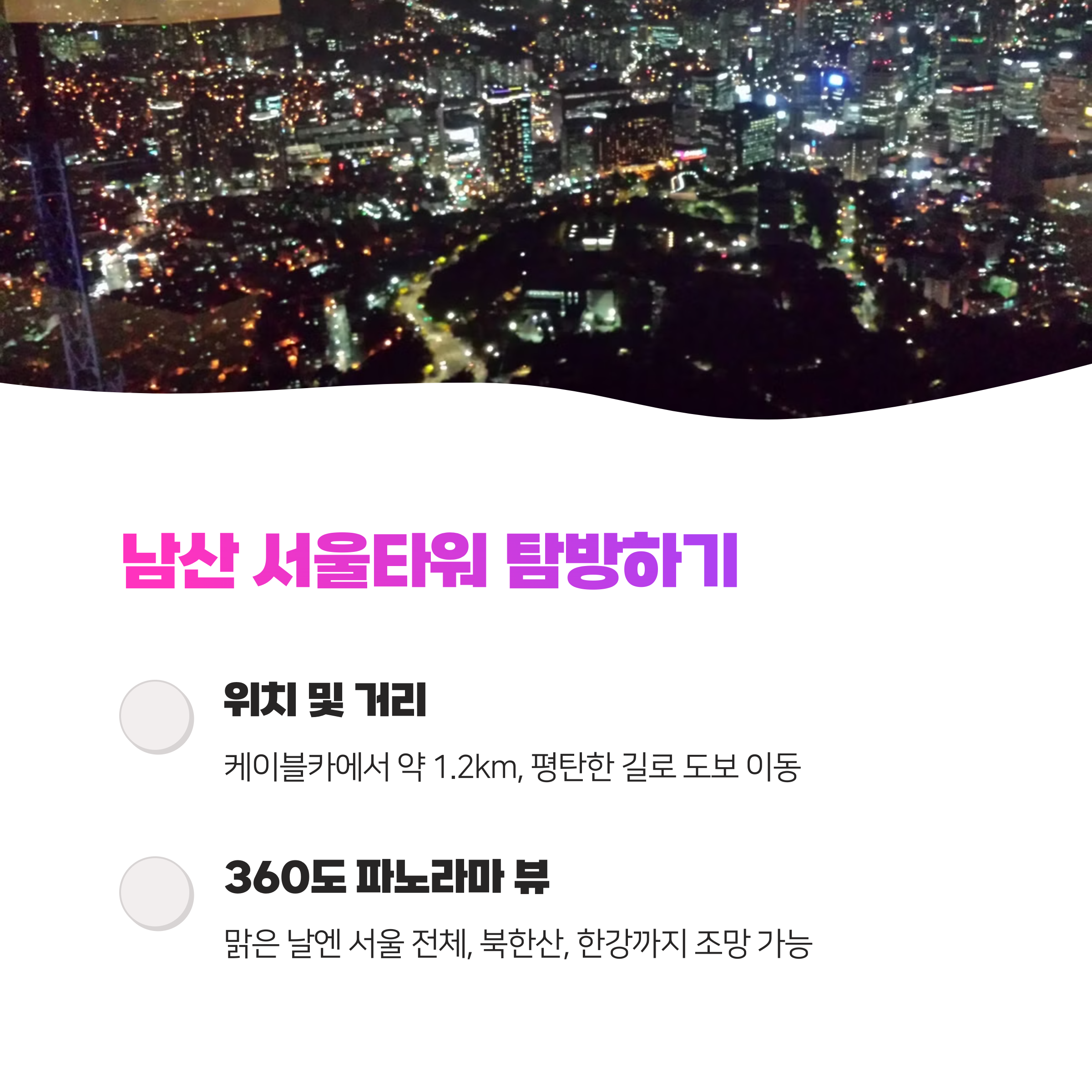 이 글에서는 명동에서 남산까지의 효율적인 이동 방법부터 케이블카, 남산 오르미, 서울타워까지 남산을 100% 즐길 수 있는 방법을 알려드릴게요! 이 글만 따라가면 시간을 절약하면서도 남산의 모든 매력을 제대로 만끽할 수 있을 거예요. 🌄✨