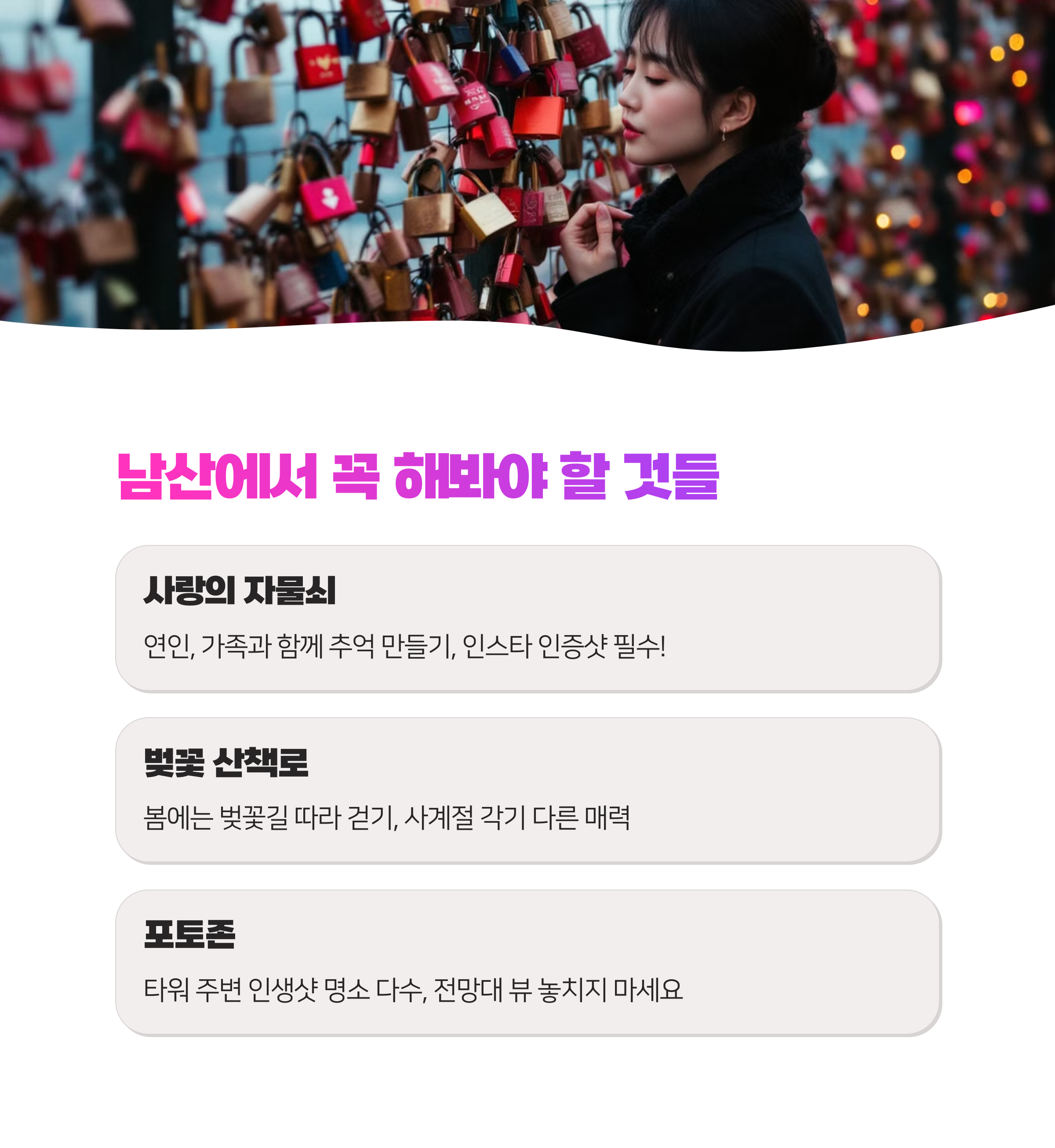 남산에는 사진 찍기 좋은 포토존이 많이 있어요. 특히 서울타워 주변에는 사랑의 자물쇠가 있는 곳이나 전망대 등 인생샷을 건질 수 있는 장소가 많답니다.