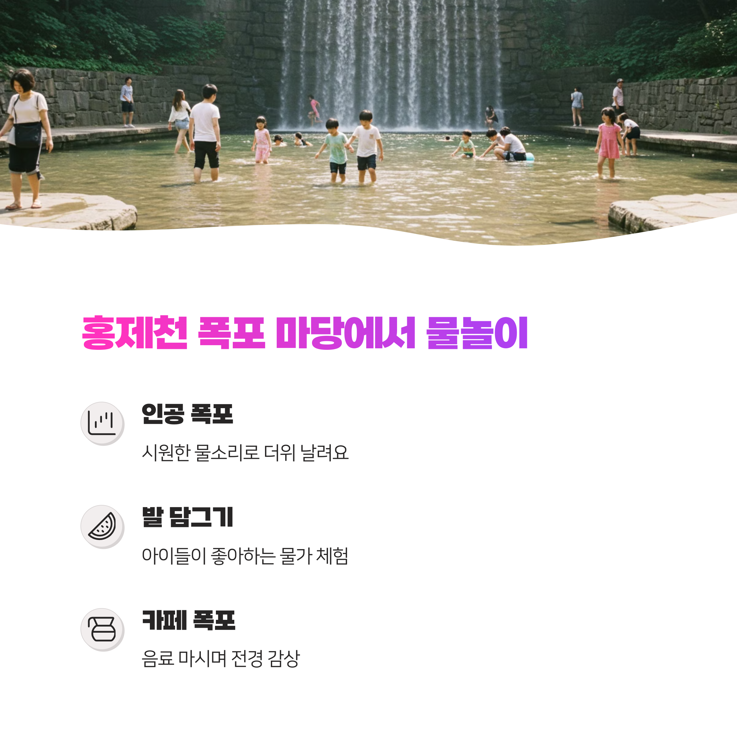 서울 도심 한가운데서 시원한 폭포와 함께 더위를 식힐 수 있는 홍제천 폭포 마당은 여름철 가족 나들이에 특히 좋은 장소예요.