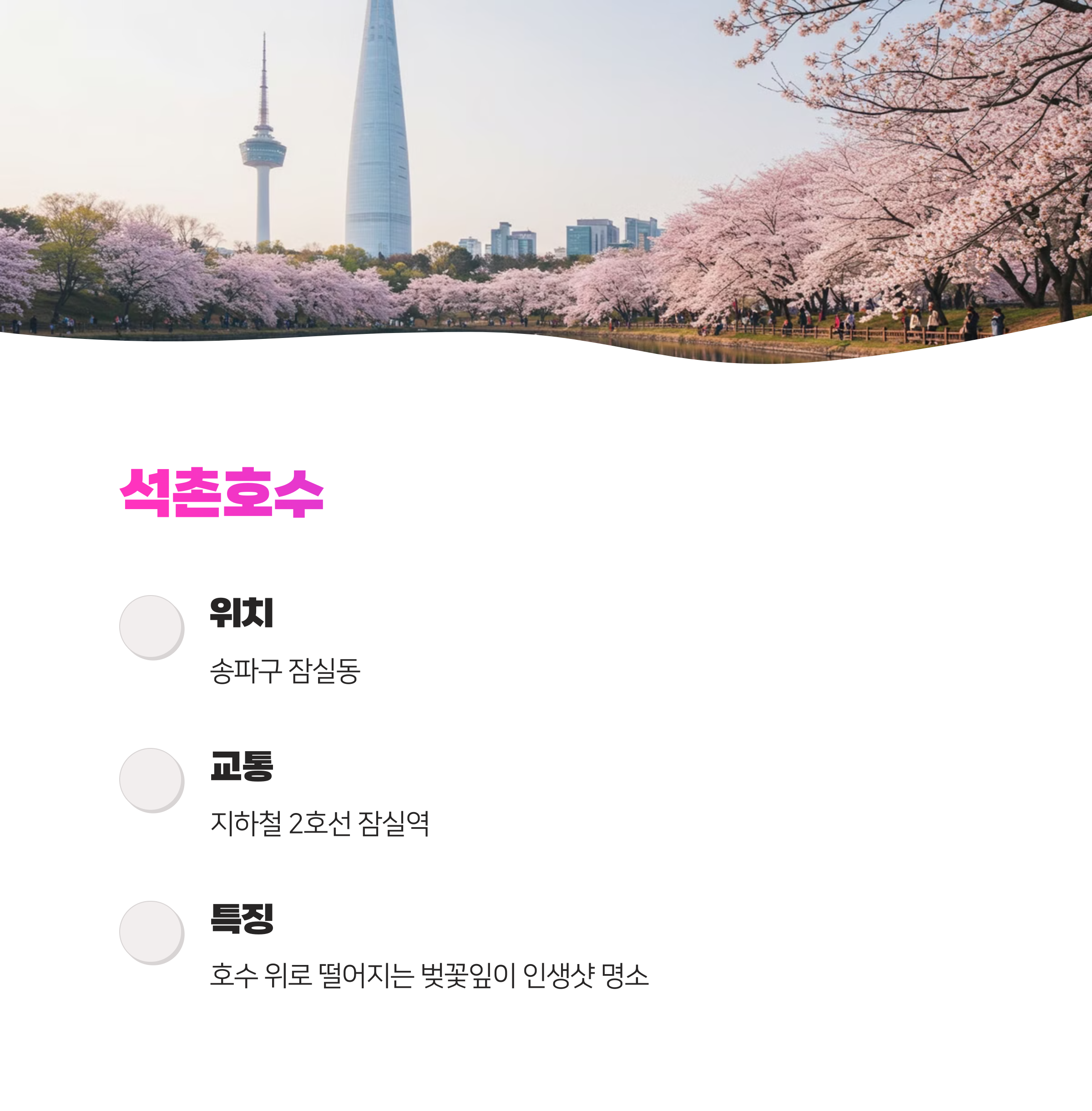 • 🌸 인기 TOP3: 여의도, 석촌호수, 서울숲