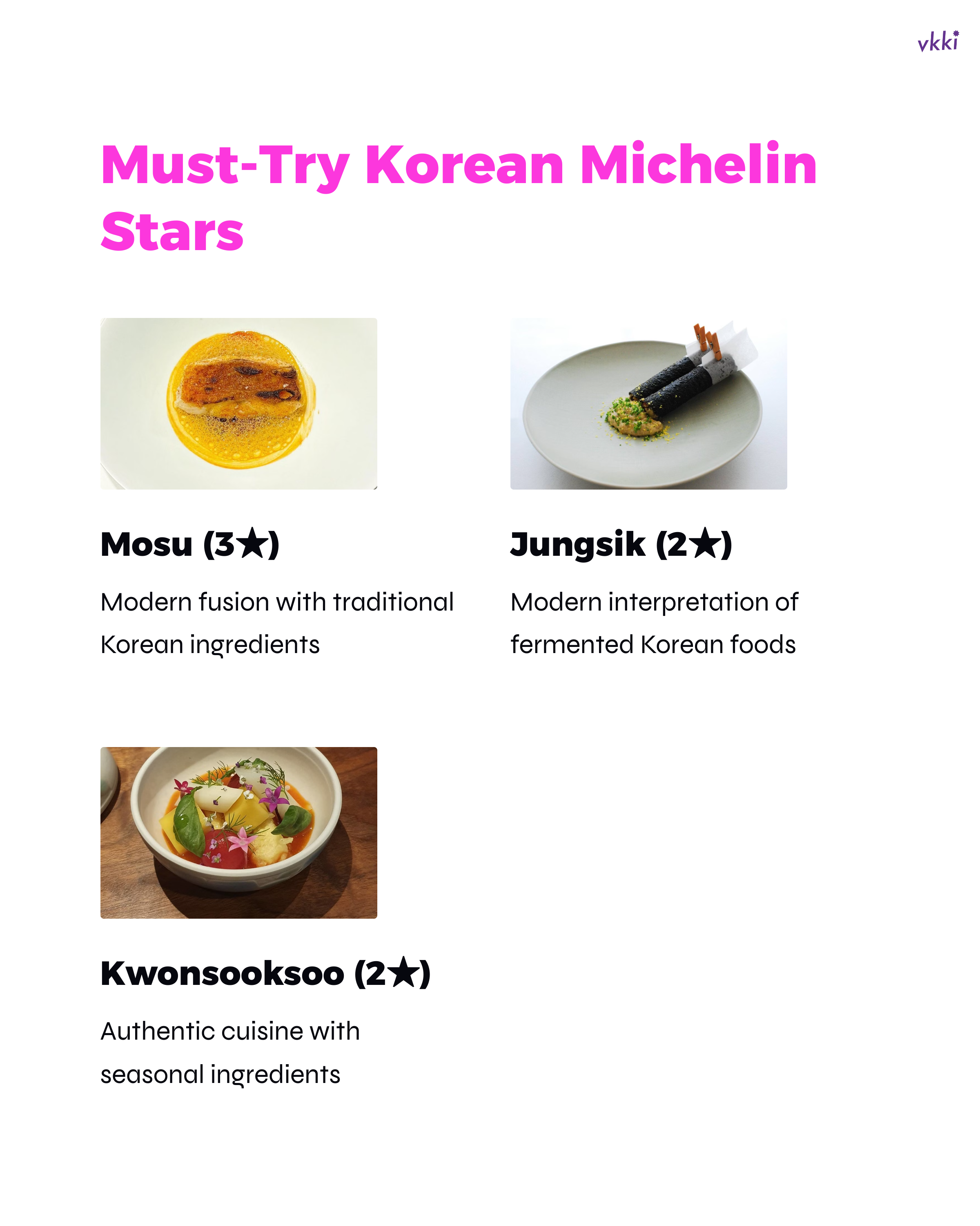 - Jungsik (2 stars): Course meals that interpret traditional Korean fermented foods in a modern way https://maps.app.goo.gl/LUNA6jZQJRbFxUms5