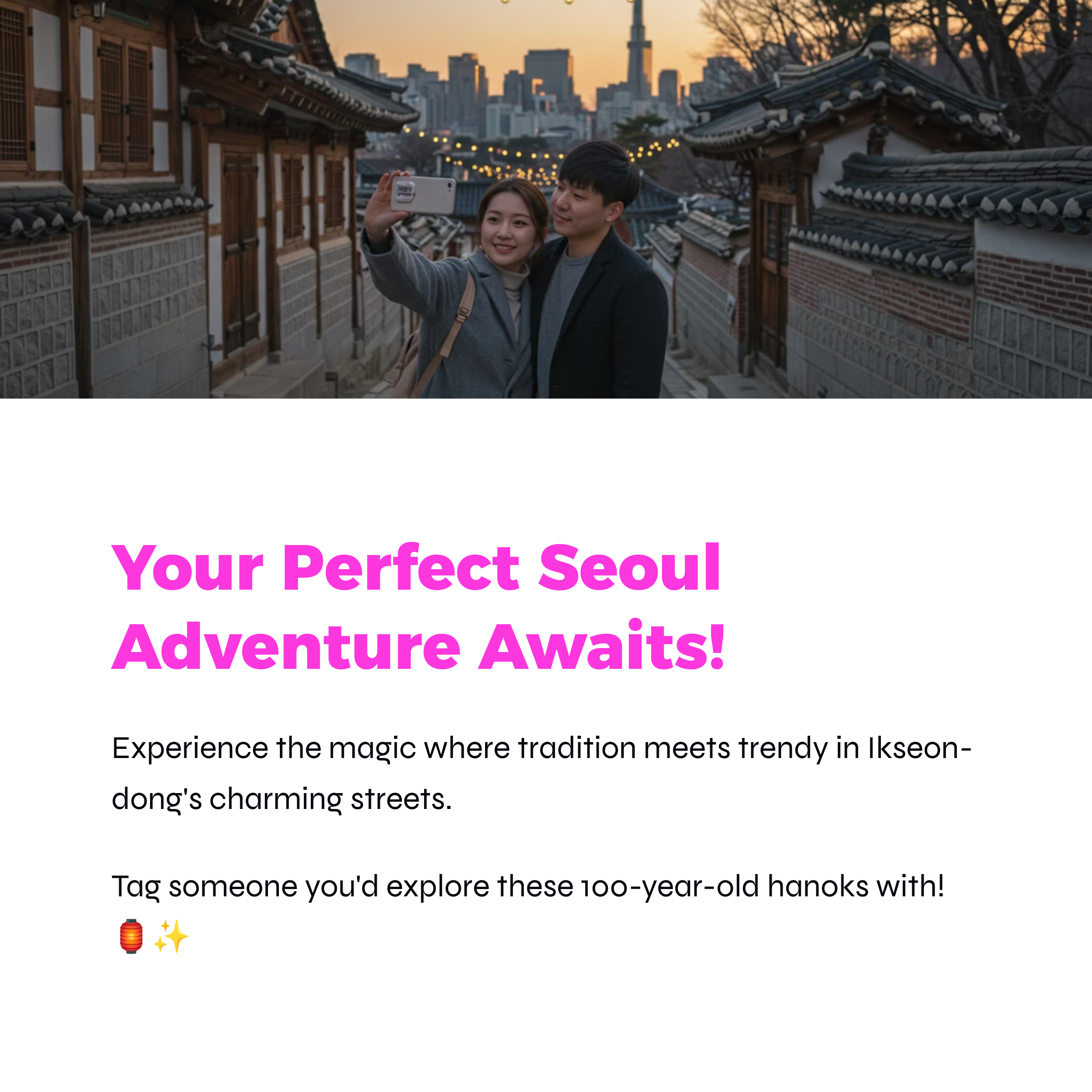 Ikseon-dong is a small but charming street where tradition and modernity harmoniously coexist. Experience traditional Korean hanoks while enjoying trendy cafes and restaurants – be sure to add this to your Seoul travel itinerary! 🏮✨