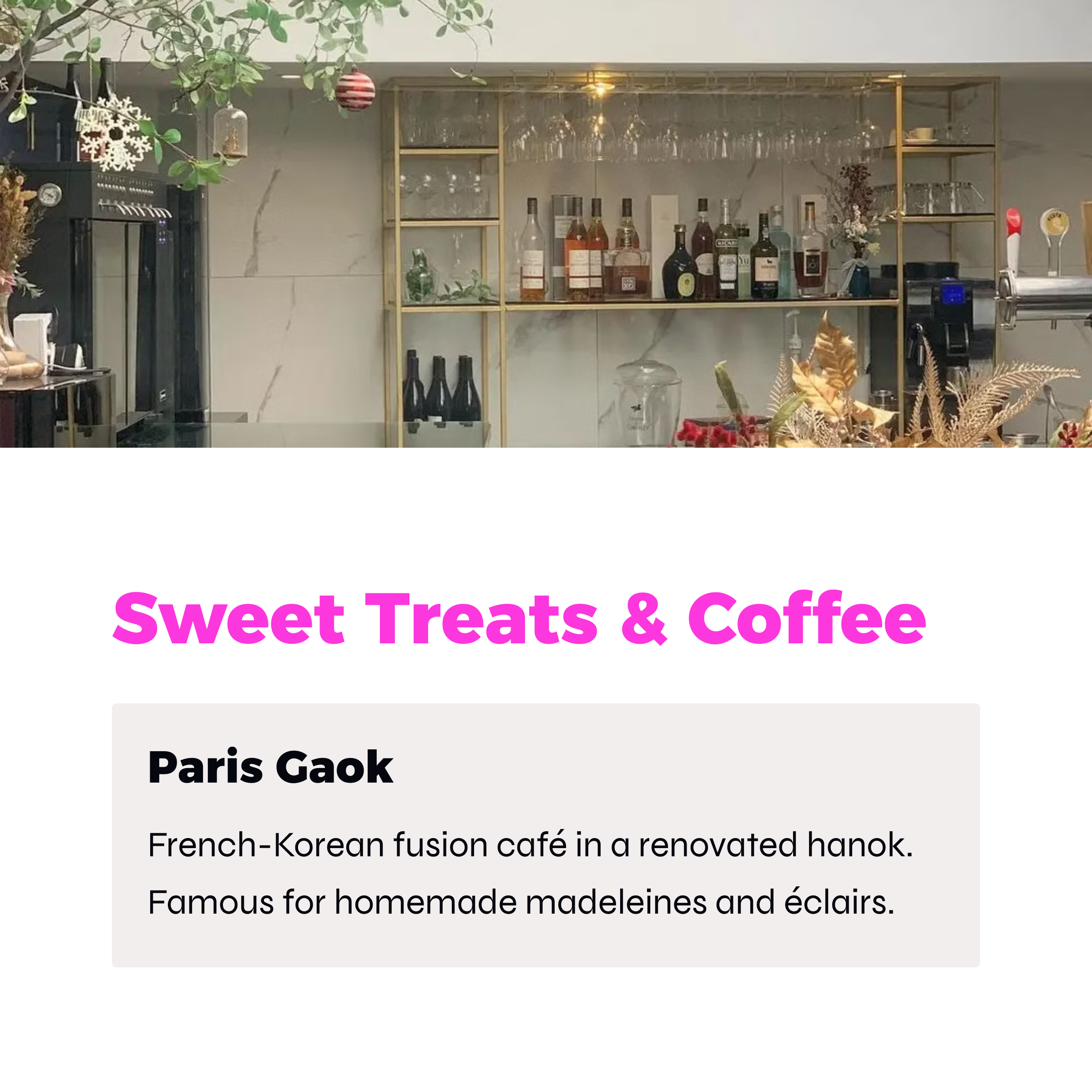 One of the most popular cafes in Ikseon-dong, where you can experience a French Parisian atmosphere. Housed in a renovated hanok with vintage interior design, you can enjoy various desserts and beverages.