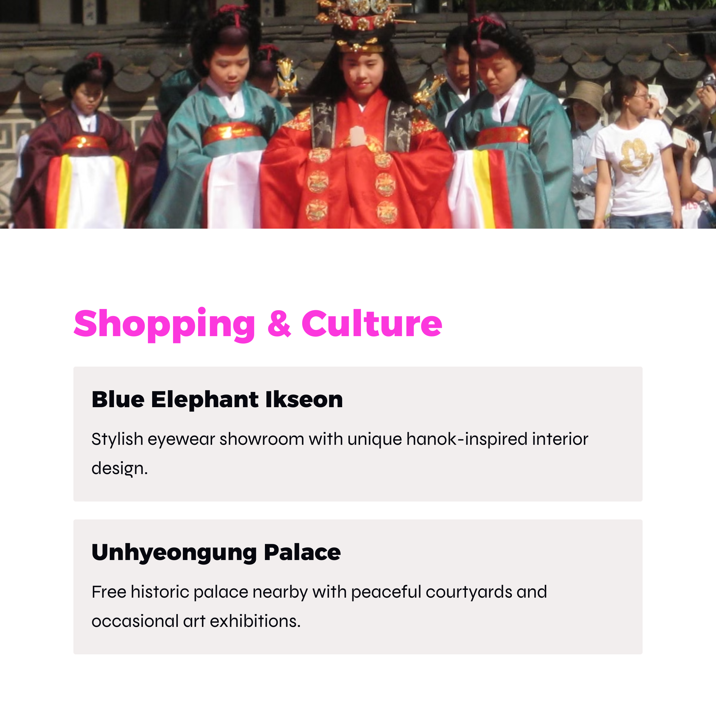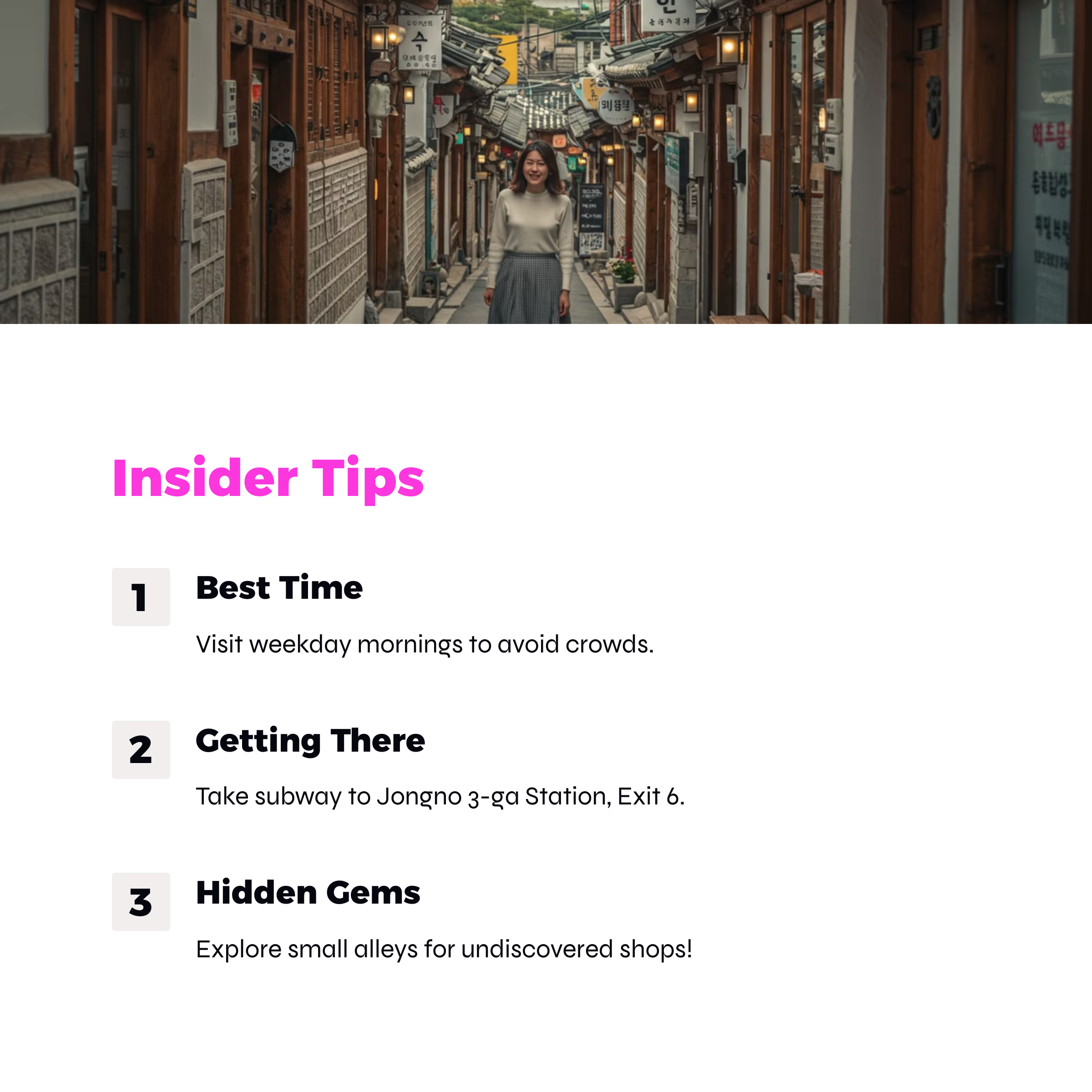 - Transportation: Take subway lines 1, 3, or 5 to Jongno 3-ga Station and exit through Exit 6 to easily find Ikseon-dong.